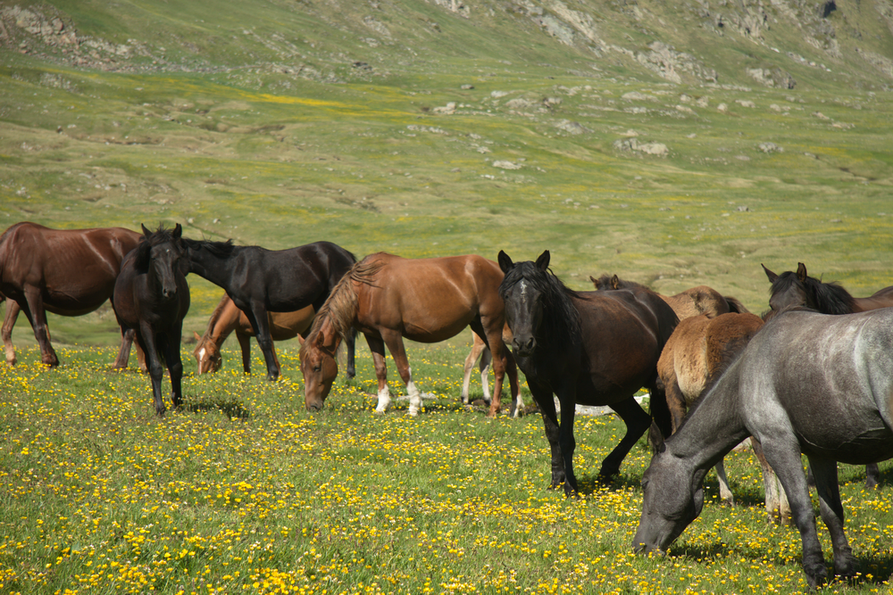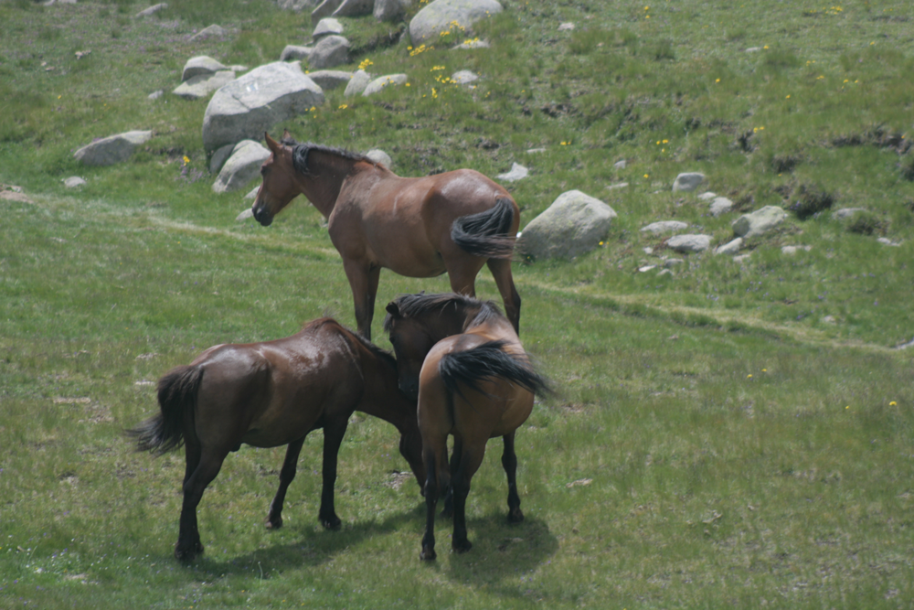 На тази снимка се виждат коне, пуснати свободно в Рила планина. Виждали сме коне, живеещи свободно и в Пирин, и в Стара планина, и в Родопите - във всички български планини. Говори се че дори има коне, които са избягали от своите стопани и се размножават съвсем свободно, подобно на мустангите в Дивия Запад. Нямаме информация доколко това е вярно; според други разкази на очевидци при нападение от мечка конете се строяват в кръг с муцуните си една към друга, а задните им крака образуват външността на кръга. Вътре в окръжността са малките кончета; при опит на мечката да захапе някой кон тя получава такива ритници, че бързо разбира с каква невъзможна задача се е заела. Дали това отговаря на истината или са истории от Ловно - рибарския съюз, също не знаем. Факт е обаче че конят рита изключително силно и може да причини много тежки травми, особено в лицево - челюстната област.