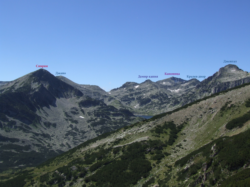 Връх Вихрен и Синанишкото странично било, заснети от Кончето. Добре се вижда връх Гредаро