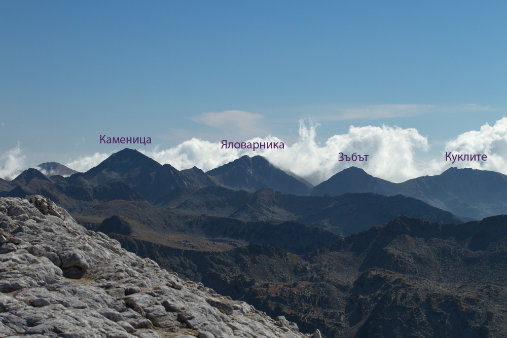 Снимка на различни върхове в Пирин - имената им са написани с бели букви. Снимката е направена от връх Вихрен при ясно време през есента на 2014 година. Както се вижда, на юг от Вихрен по протежение на Главното Пиринско Било са разположени голям брой атрактивни върхове, които си заслужава човек да изкачи. То и на север от Вихрен е същата работа! На преден план се вижда връх Тодорка - с прочутите му каменно улеи, които през зимата са идеални за образуване на лавини. В горния ляв ъгъл на кадъра дори сме направили грешка - разбира се, не умишлено. Върхът, който се вижда, е Малък Полежан, а не Голям Полежан.